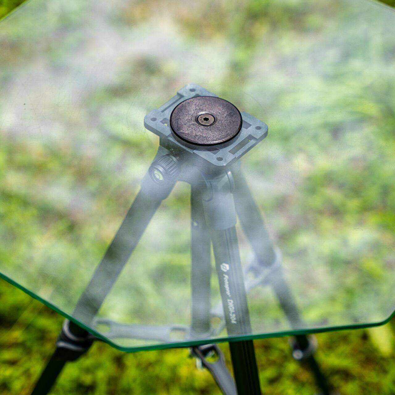 KINOKOテーブルを三脚テーブル化するには、付属する六角レンチを使ってテーブルをCOBAN PLATEとサンドイッチするだけ。一旦組み立ててしまえば、アルカスイス互換の三脚雲台やクランプに工具不要で素早く付け外しが行なえます。